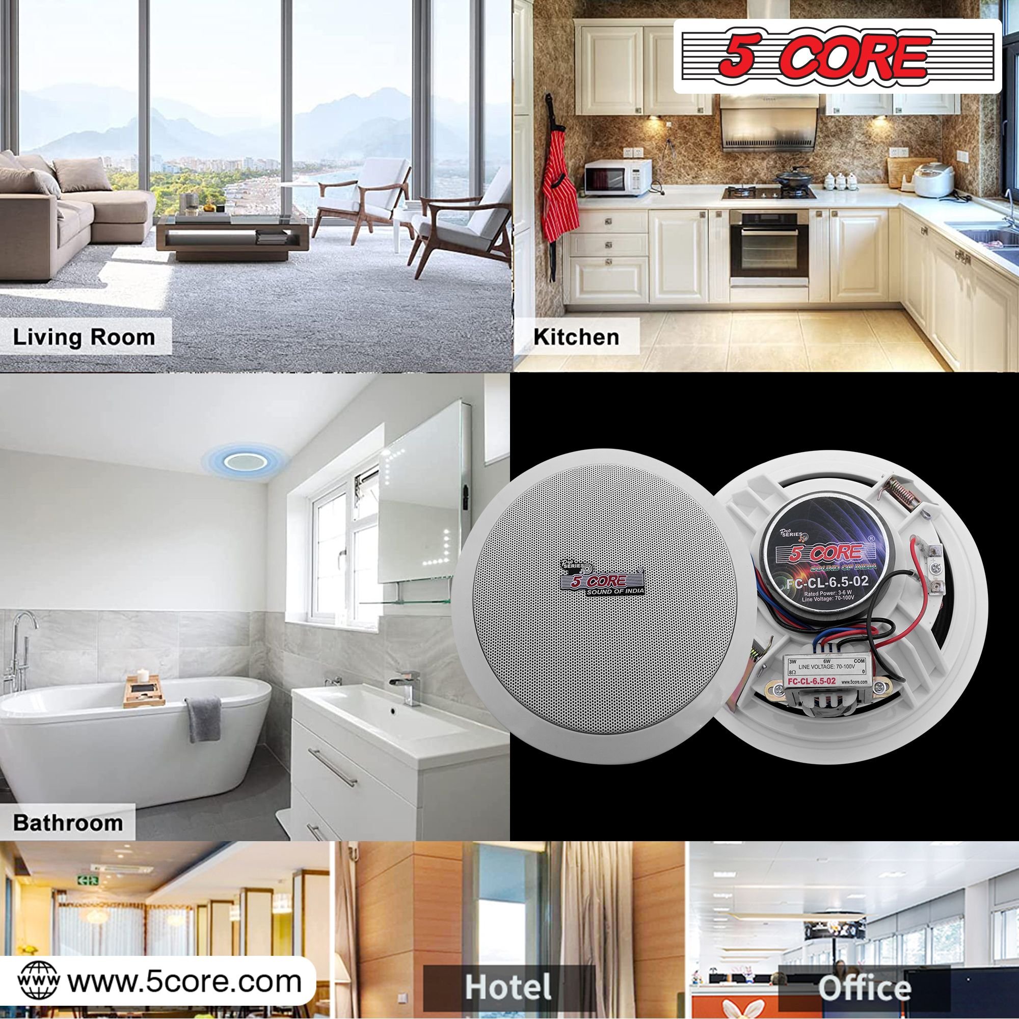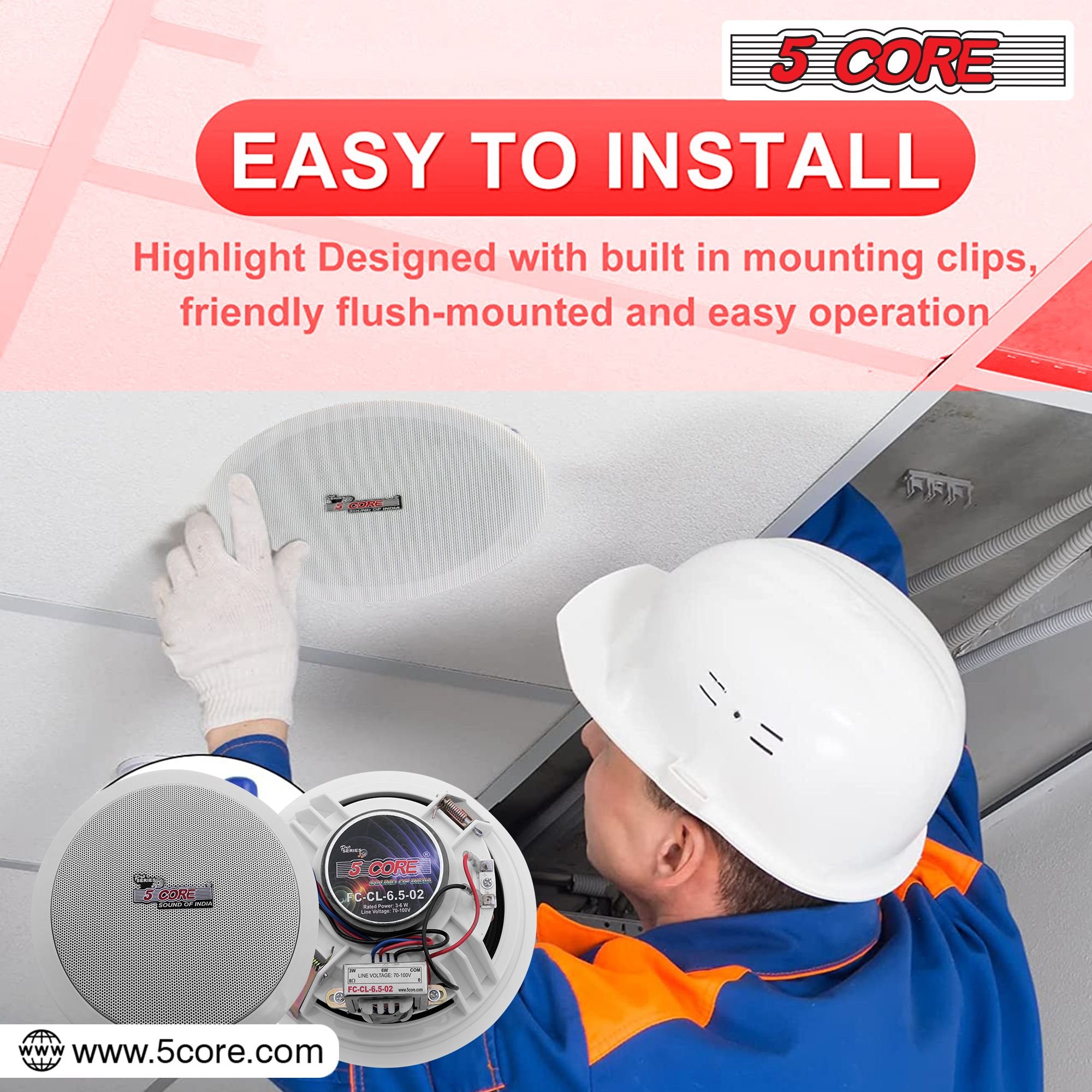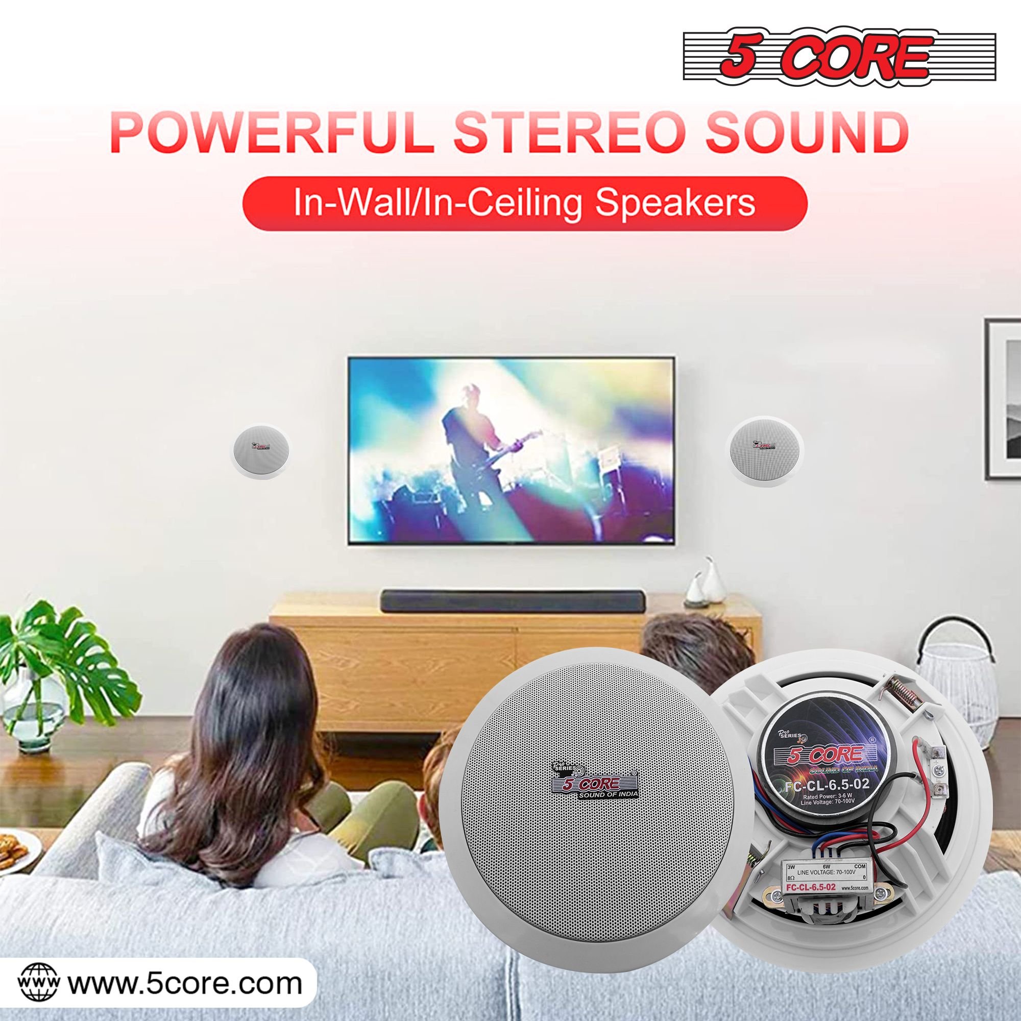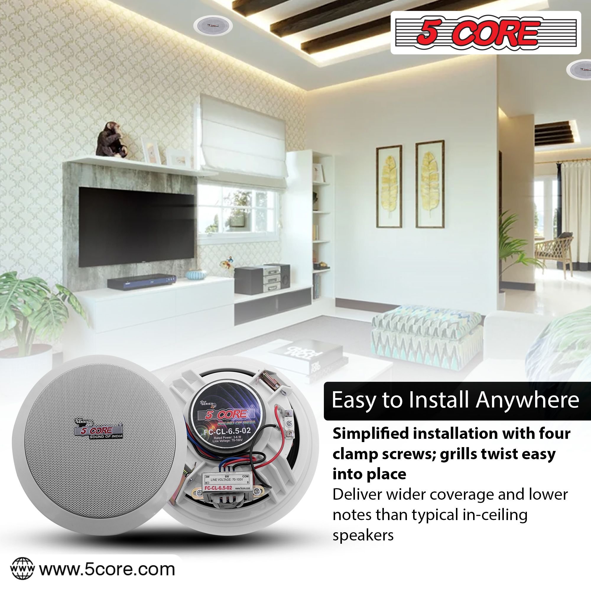 2.PERFECT FIT - Standard 6.5" in ceiling speakers, designed for easy installation into any ceiling or wall space while offering high-fidelity audio coverage.