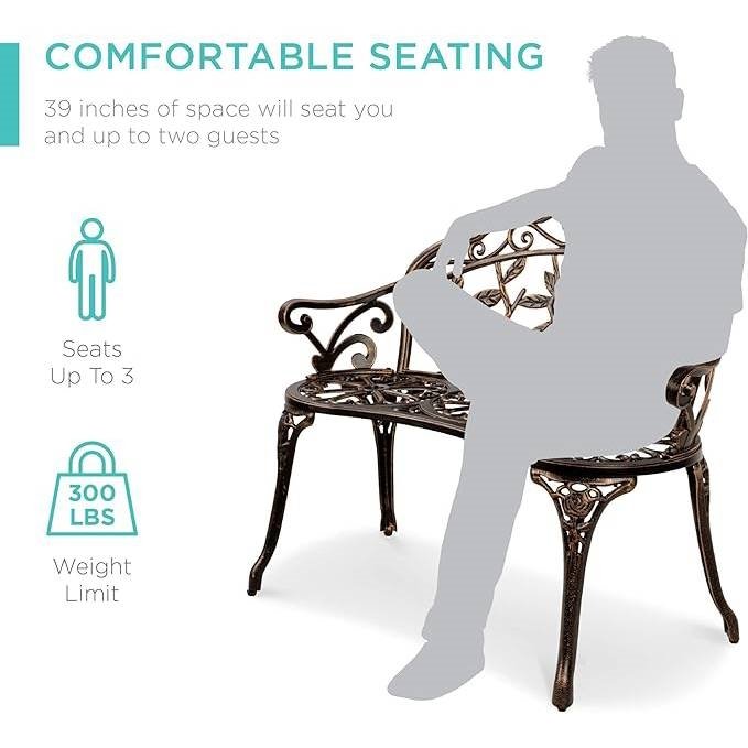 Lightweight and durable construction makes this Outdoor Patio Garden Bench with Backrest in Antique Bronze Metal Finish an easy addition to your porch, patio, deck, or garden nook. Crafted with an all-steel frame and a rustic, weather-resistant finish to accent your porch or patio for years to come. 39-inch seat comfortably holds up to 3 guests with a weight capacity of 300 pounds. Beautifully detailed with unique floral accents across the back, seat, and even the legs. Cleverly designed to be lightweight with an open seat and back to promote airflow and allow easy cleanup while still providing support; OVERALL DIMENSIONS: 39"(L) x 21.25"(W) x 31"(H); Weight Capacity: 300 lbs.