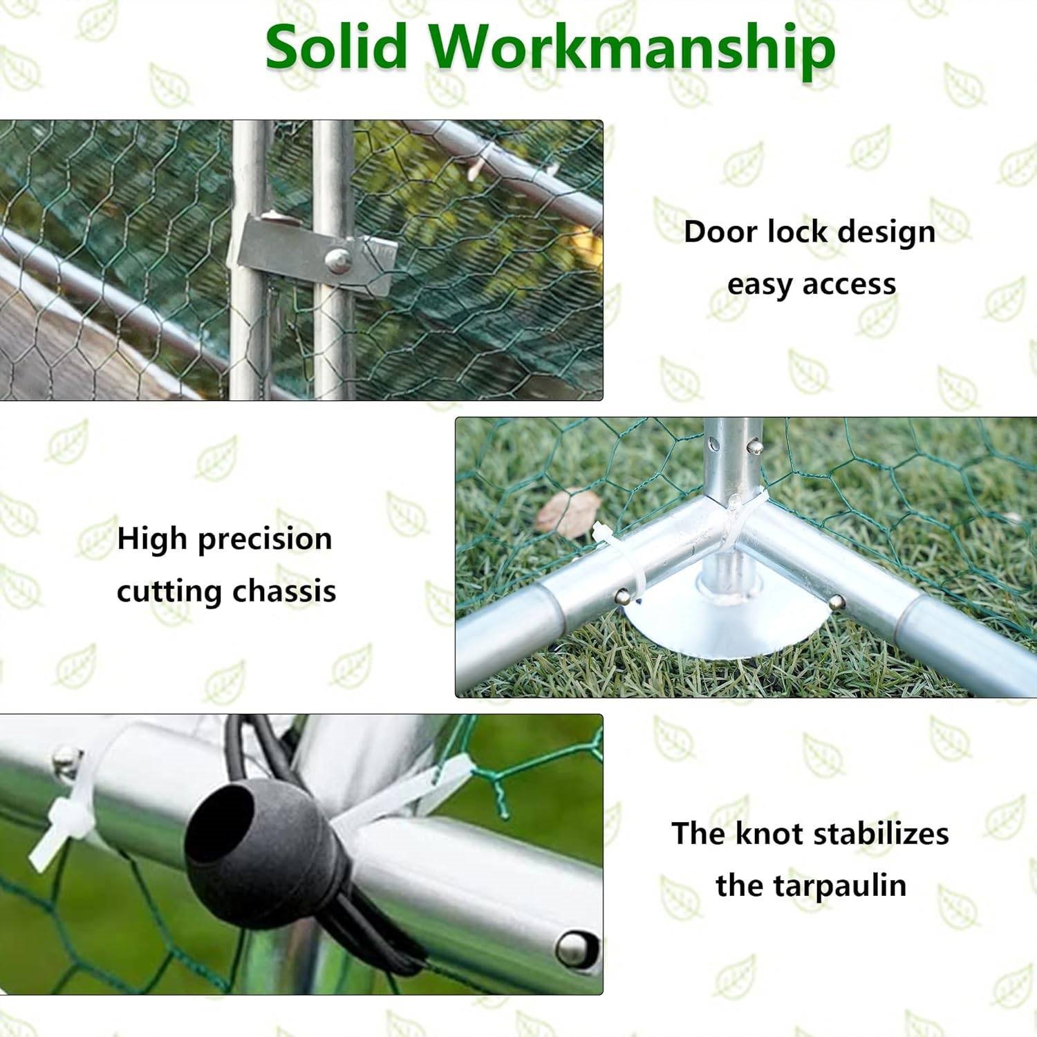 • Quality workmanship- This chicken cage is made of high-quality galvanized steel pipe, anti-corrosion and anti-rust, more durable. The strong wall thickness of the thick steel pipe makes the chicken coop strong and stable enough in high winds and heavy rain. Hexagonal mesh design, more robust. There is no gap between the frame and the ground to prevent wild animals from invading.