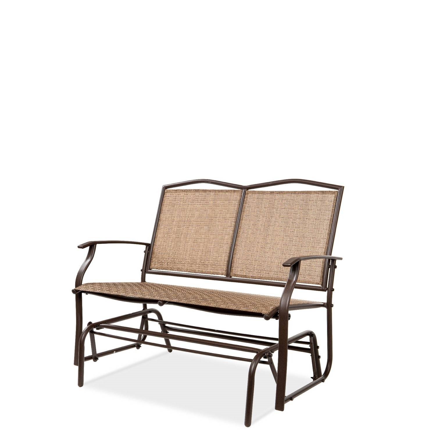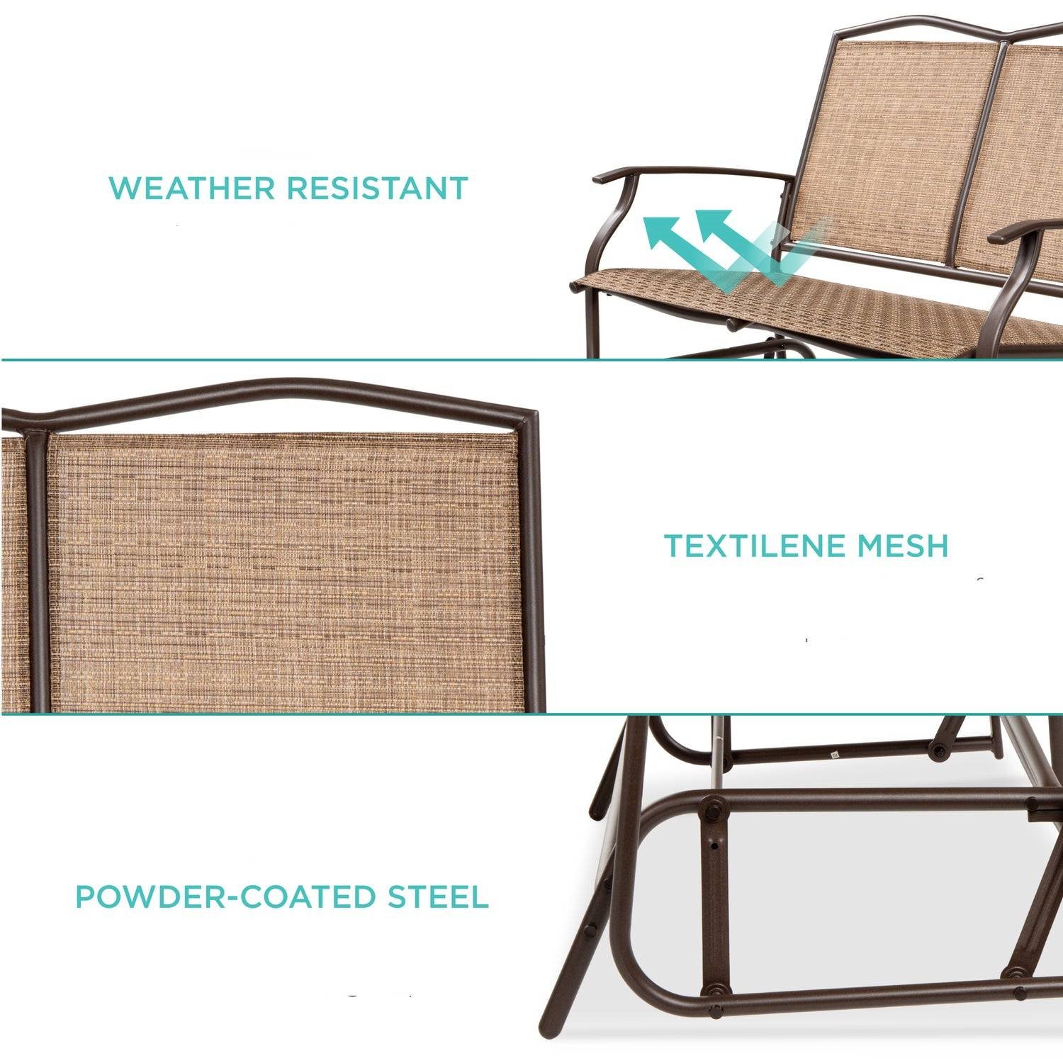 Glide into spring/summer with this 2 Seater Weather Resistant Mesh Patio Loveseat Swing Glider Rocker w/ Armrests in Brown! Built with ergonomic armrests and robust textilene fabric which conforms to your body to provide a comfortable bench for hours of relaxation. The sturdy, yet light frame allows you to turn your patio, garden, balcony, or porch. Classic swing glider features a 38-inch loveseat to support you and your favorite guest-up to 440-pound capacity. Fade- and weather-resistant textilene fabric woven over a powder-coated steel frame provides lasting quality and comfort. A steel spring and pivot system lifts the seat to provide a smooth rocking motion while you relax in comfort