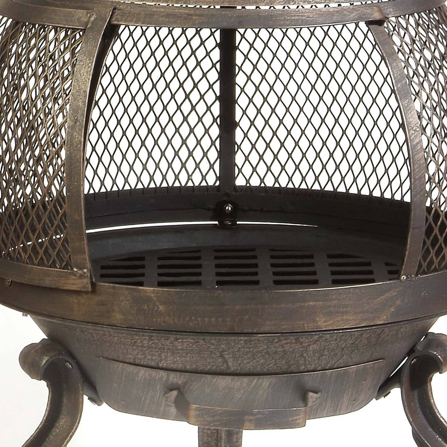 Add warm color and a fantastic heating element to your patio with this Rustic Outdoor Steel Cast Iron Chimenea Wood Fire Pit. Situating this unit within your yard creates an amazing gathering spot for friends and family. Has a 20.5 inch diameter, center chamber accommodates fire logs, and a sliding door makes it simple to access this area. The included, steel grate keeps the logs elevated for air circulation and an even burn, and its large grid allows debris to drop into the integrated ash catcher, providing both safety and convenience. Three, 9.5 inch tall legs form a stable support, perfect for placement on a level, fireproof surface, while a generous, 24 inch tall chimney creates even more height and visual interest. Curved, raised lines on this vent celebrate the rounded piece, and a top cap prevents rain from reaching the flames. A band of wire mesh helps keep the fire contained, and the steel and cast iron construction forms a lasting item.