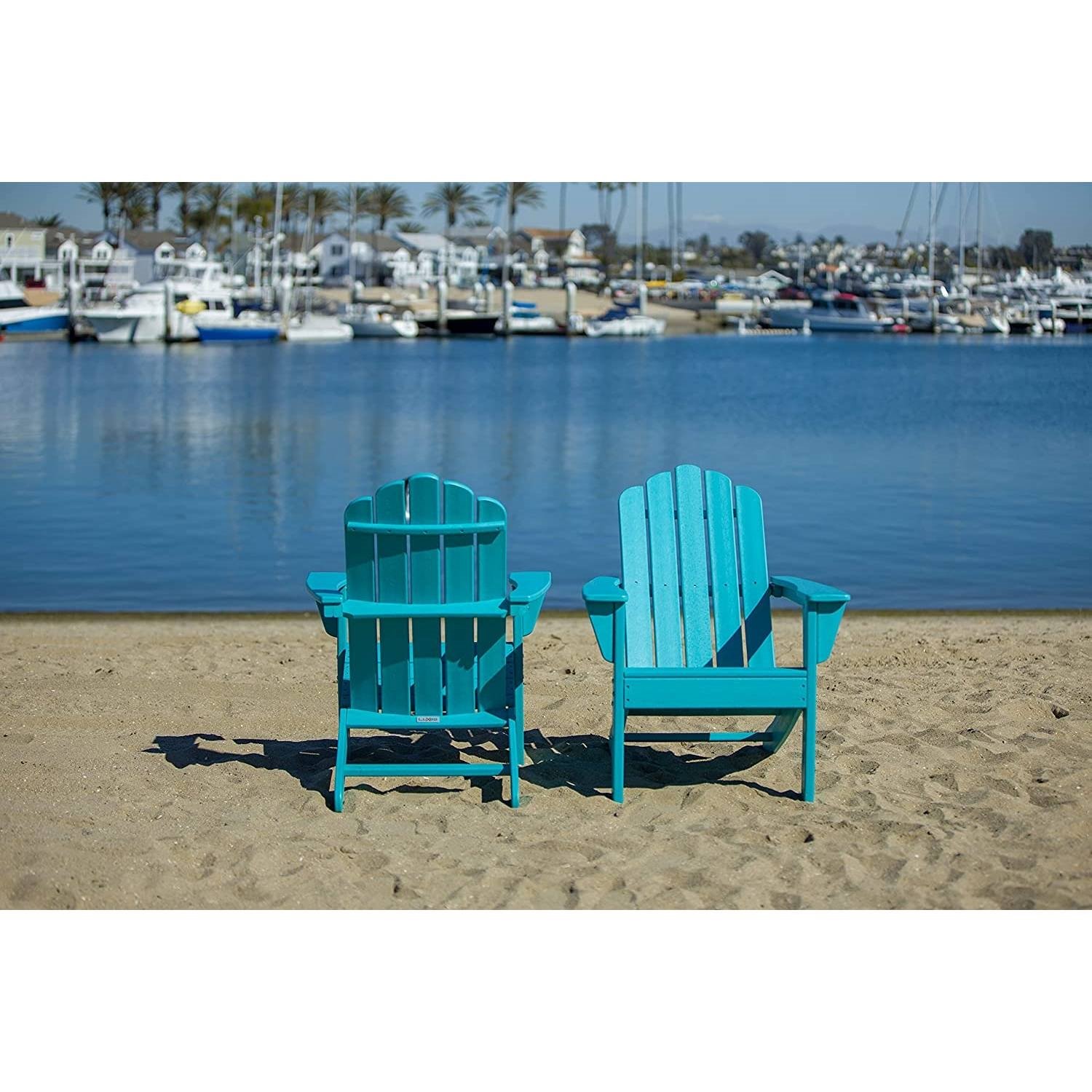 Relax in style with classic comfort and extra roomy All Weather Recycled Blue Poly Plastic Outdoor Patio Adirondack Chairs - Set of 2. These all weather Adirondack chairs provides a perfect place to take in the beauty of your backyard while enjoying your morning coffee or catching some rays at the beach. A curved backrest allows you to comfortably lean back and relax. Also designed with wide arms to offer a place to perch a drink as well as rest your hands. These chairs are made of all weather HDPE recycled material, so you won't have to worry about rot, splinters, chipping, peeling, or cracks. These sturdy all weather Adirondack chairs are built to withstand sun, snow, and even strong winds. No painting, staining or waterproofing required to hold up to the outdoor elements.