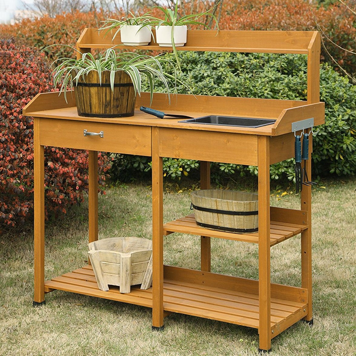 This Wooden Potting Bench Garden Work Table with Sink and Shelving in Light Oak Finish a spacious work top surface for any garden task. It provides a durable sink to make potting plants easy and to help keep workspace tidy. Featuring a large drawer that provides enough space for all of your small gardening tools and open shelves that give you more room for storage. Pre-attached side hooks included for easy reach tools.
