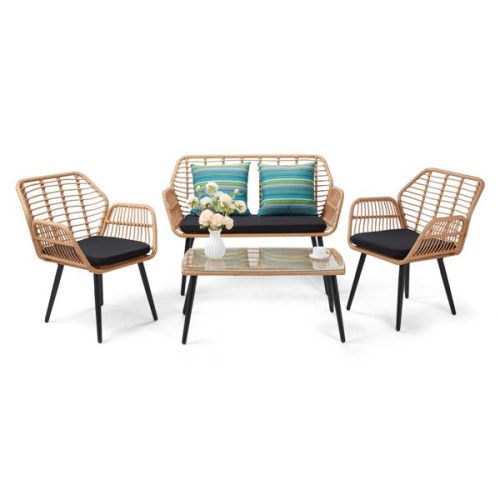 Enhance your outdoor living space with our 4-Piece Patio Furniture Outdoor Bistro Set, a perfect amalgamation of style, comfort, and durability. Designed to fit seamlessly into any backyard, balcony, or deck, this all-weather rattan set invites you to enjoy leisurely conversations, morning coffees, or tranquil evenings under the stars. Featuring a cozy loveseat, two single chairs, and a sleek table, this set provides a comfortable and stylish setting for any outdoor gathering or intimate moment.